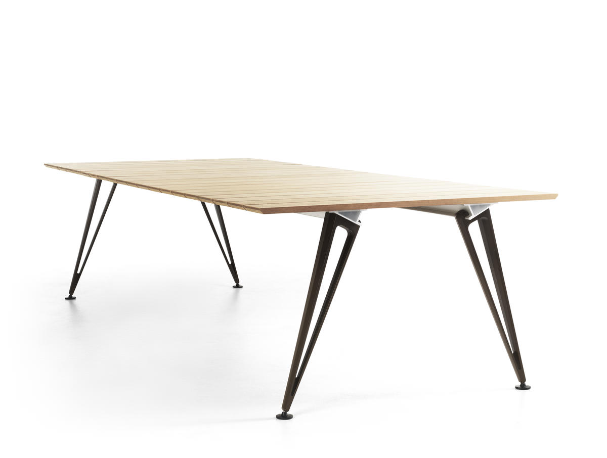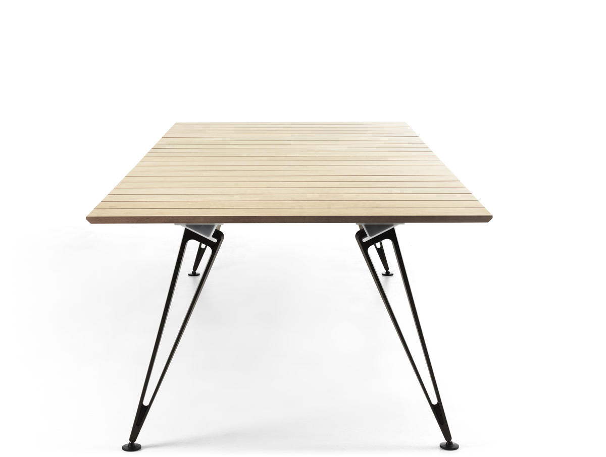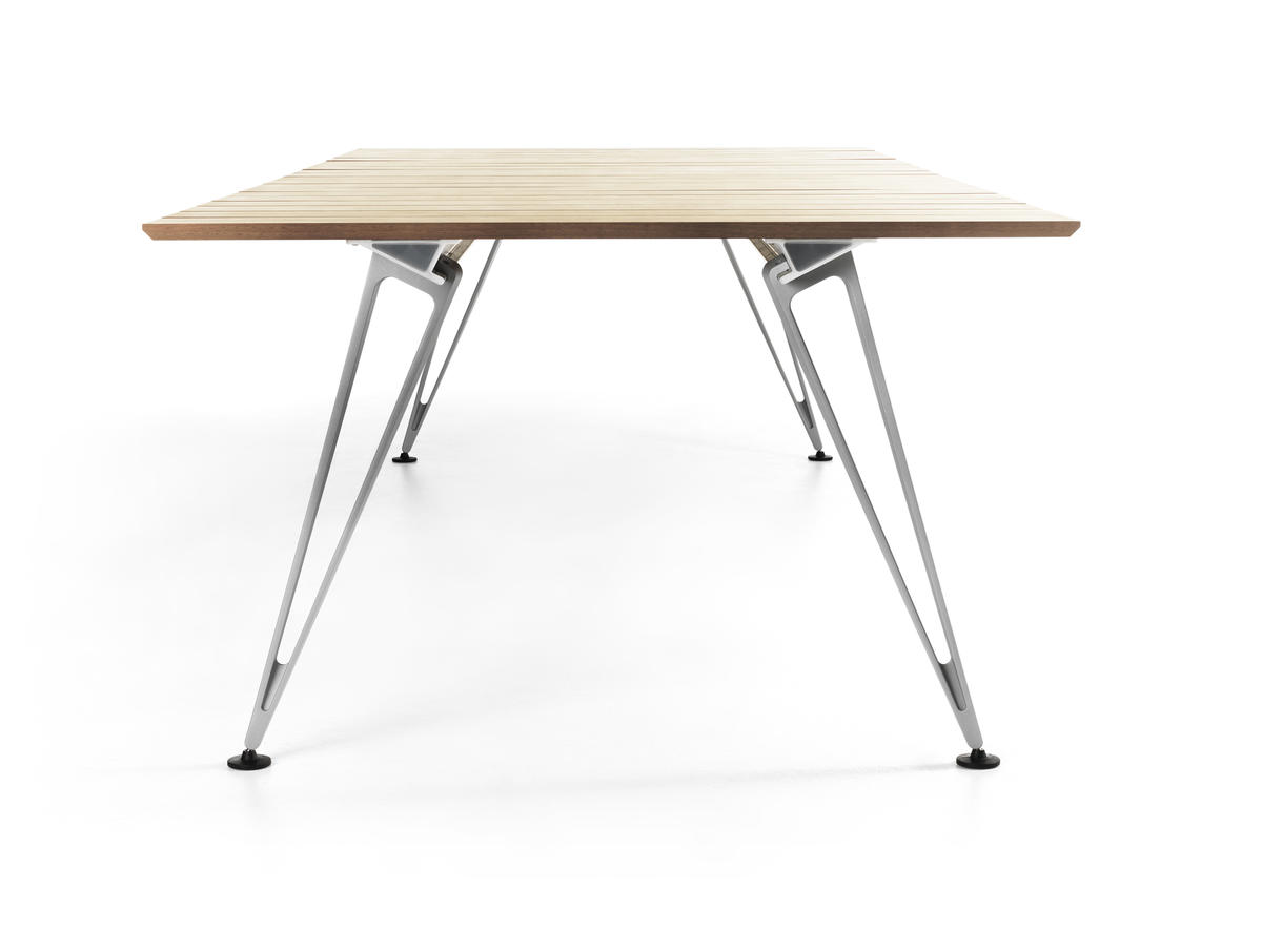 Attach Outdoor uses the same innovative structure as ATTACH table-system, with the extruded aluminum beams and attachable legs of cast aluminum, but is here combined with wooden slats instead of a table-top, allowing water to run through. This makes Attach Outdoor the perfect choice for the office atrium, home garden or outdoor restaurant.