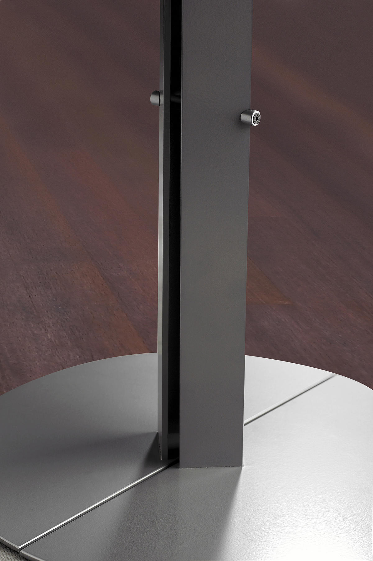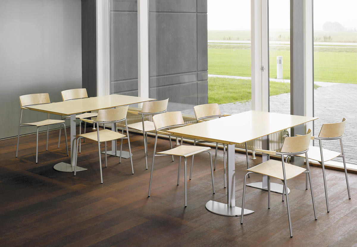 This series of column-tables is based on an idea of mine, dating back to the middle-nineties. The main-idea is quite simple: Instead of having a normal full-circle-base, I here work with a semicircular base. The column can be mounted to the tabletop in two ways: With the straight side of the base outwards – and exactly in line with the gavel of the tabletop – or with the straight side inwards. The latter way is well suited for smaller solitary tables, while the first mentioned gives the possibility to add and couple more tables. When doing that, the bases together forms complete circles and larger table-settings will appear as an architectonically calm wholeness with a minimal number of supports.