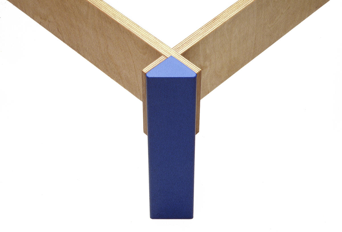 Four aprons cut out from birch-plywood is “woven” together in the corners “half-in half”, almost like a blockhouse. In the outer corner-angles four painted triangular wooden-legs are screw-mounted. A simple and strong assembly is achieved.