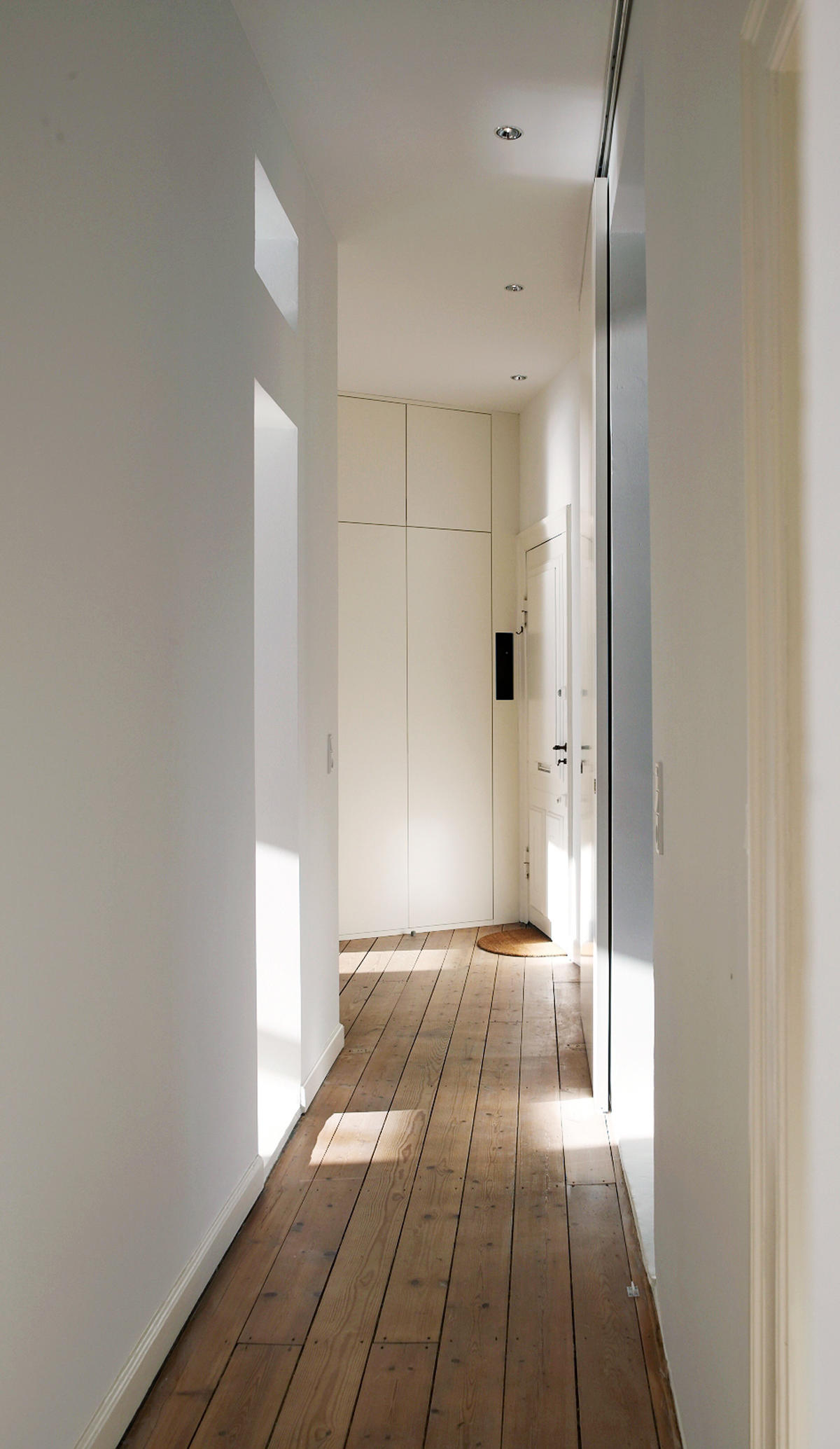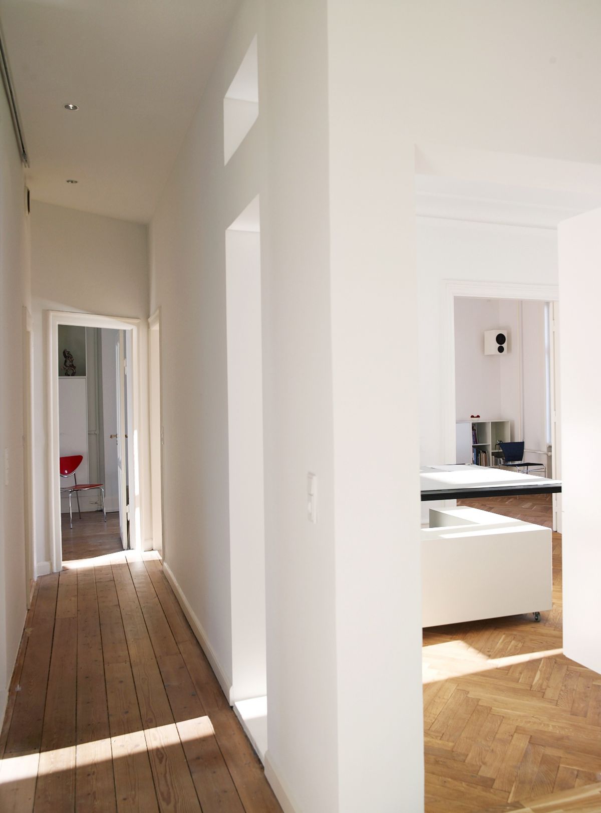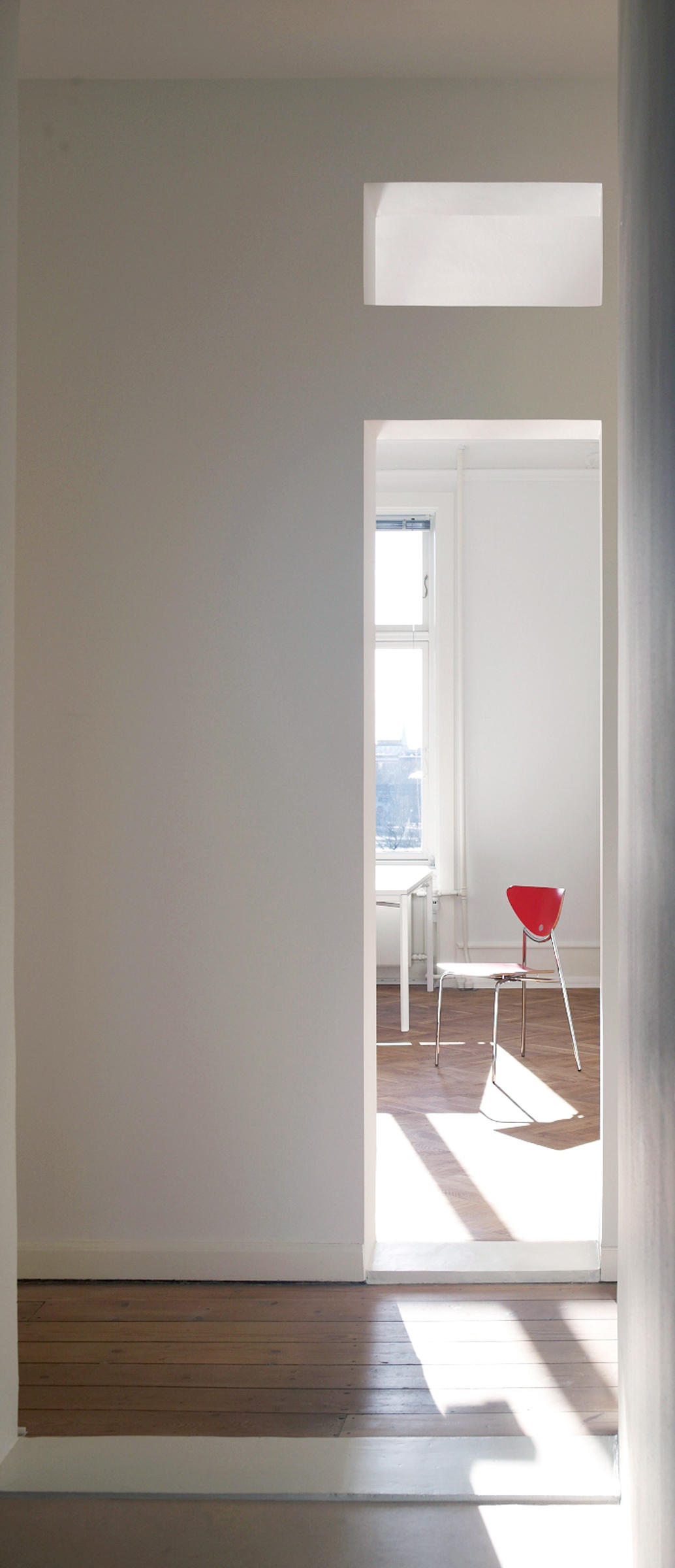 In one of the two longitudinal load-bearing walls, I expand the existing door-hole, leading to the kitchen, to the maximum possible. Opposite this expanded hole, I establish two narrow holes, allowing passage from kitchen to studio, where the most time is spent. - A short-cut for bringing the always needed coffee! At the same time those new wall-holes makes the whole apartment more transparent and improves the day-light and sun-light-passage in both sides of the relatively wide apartment.