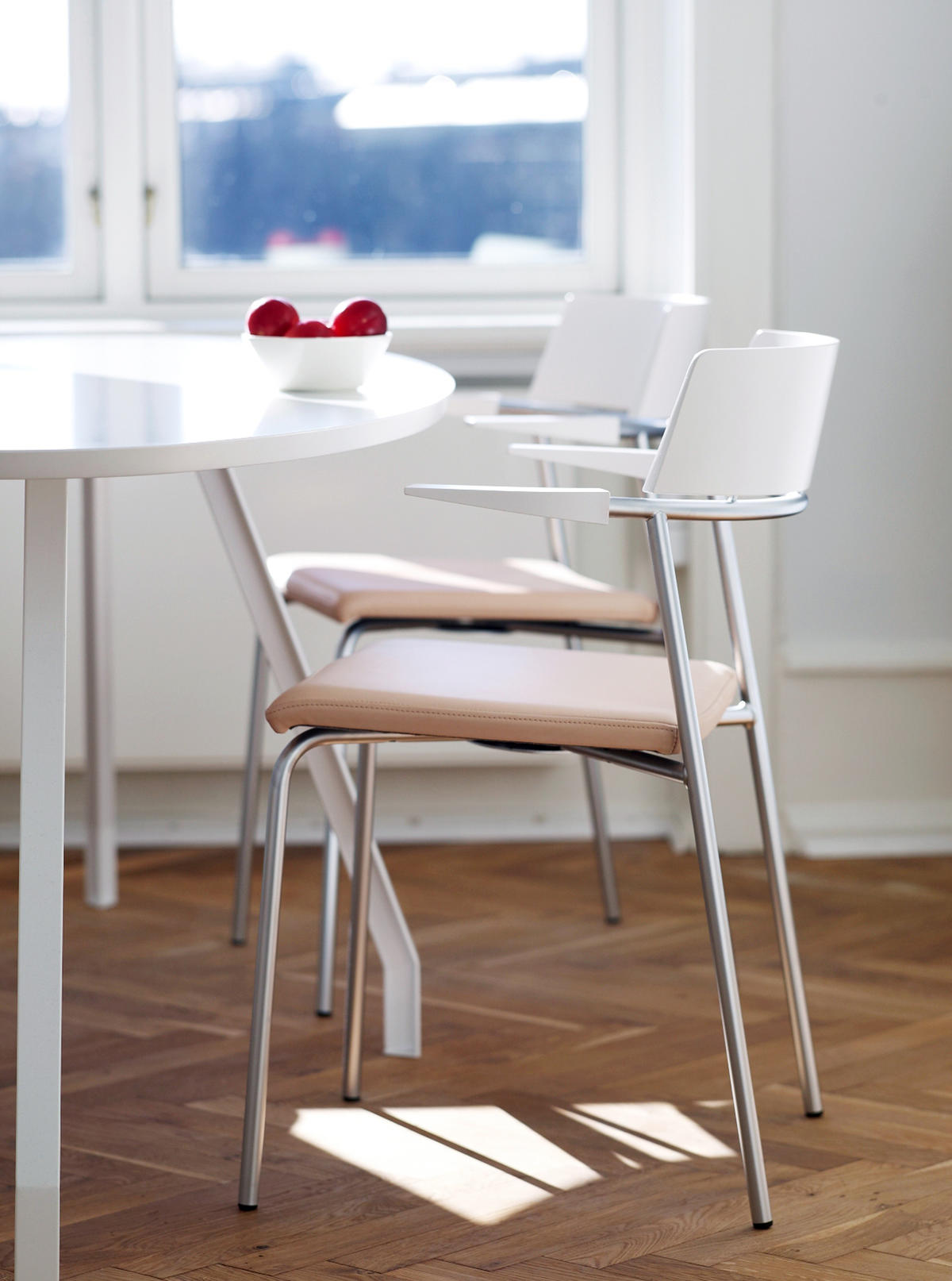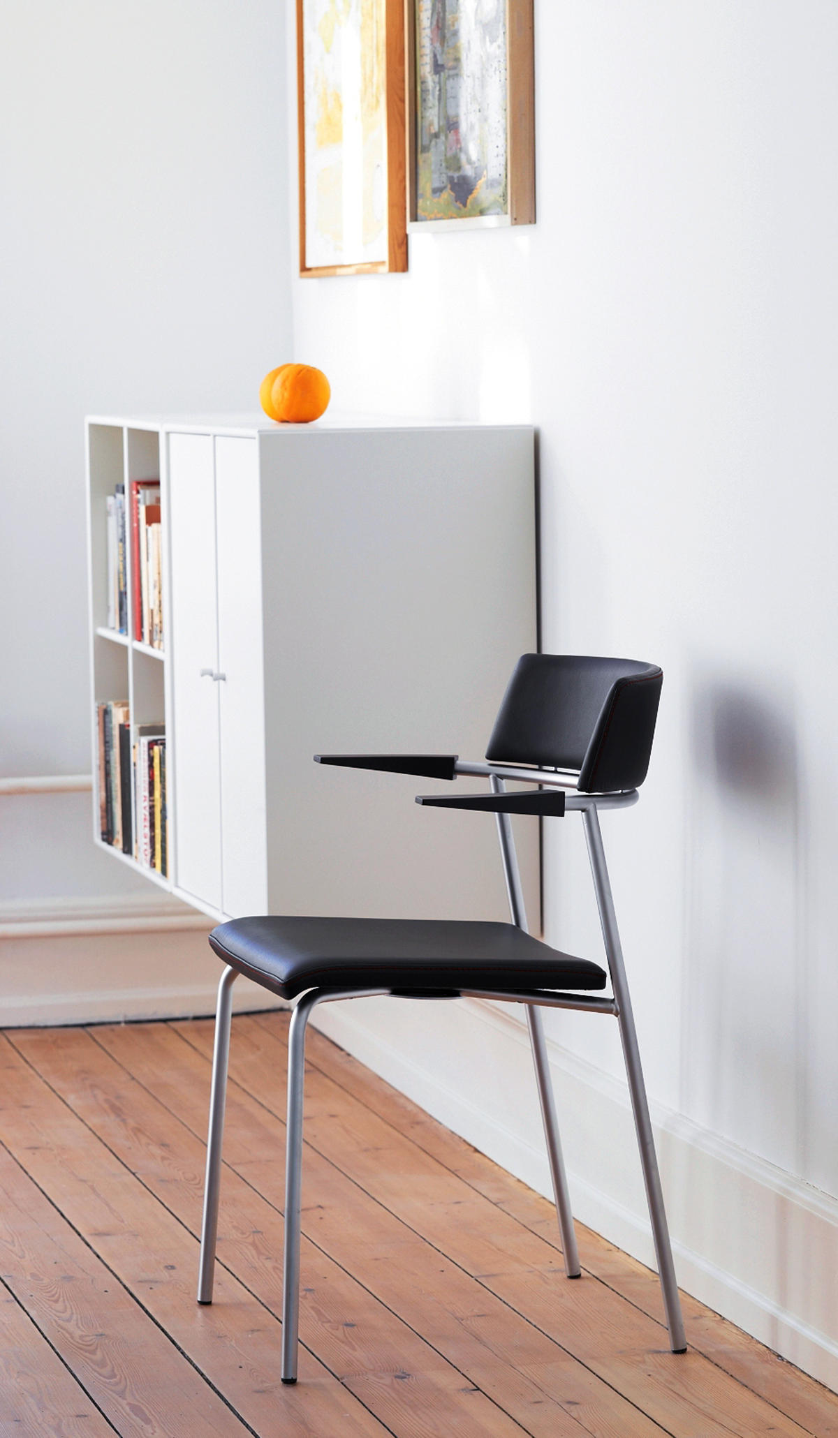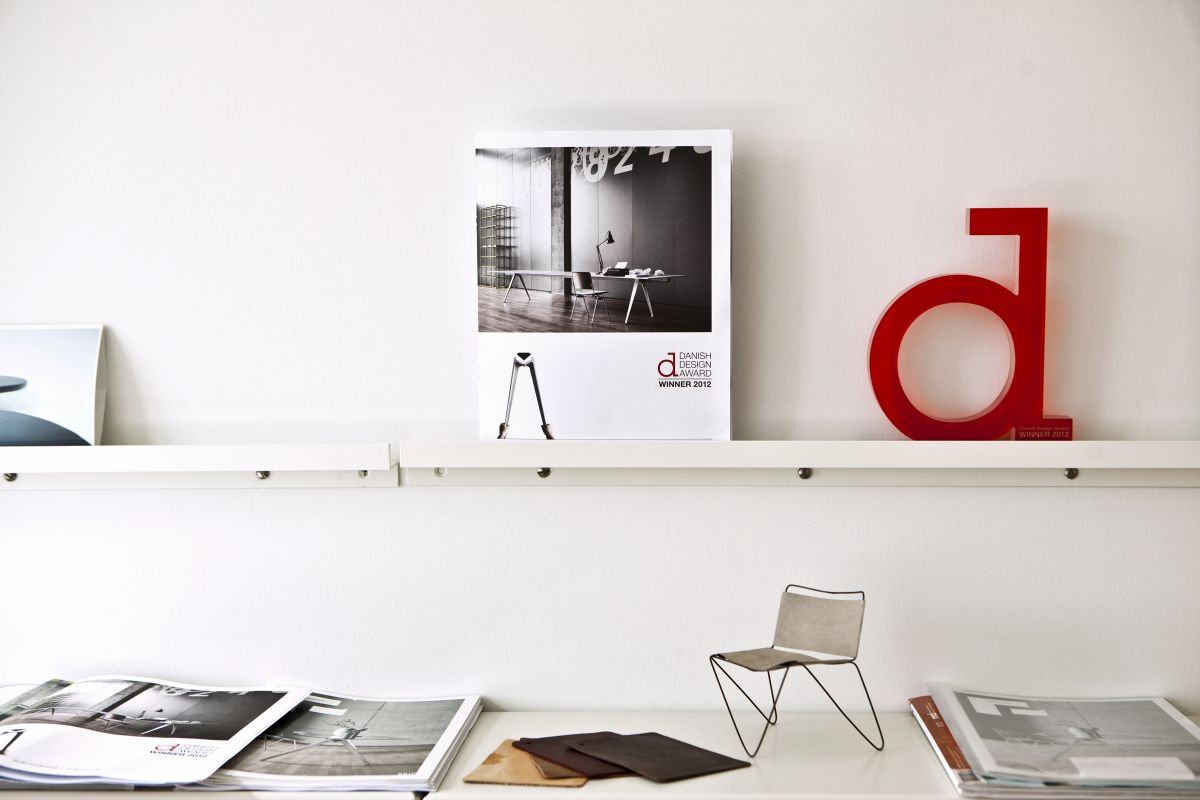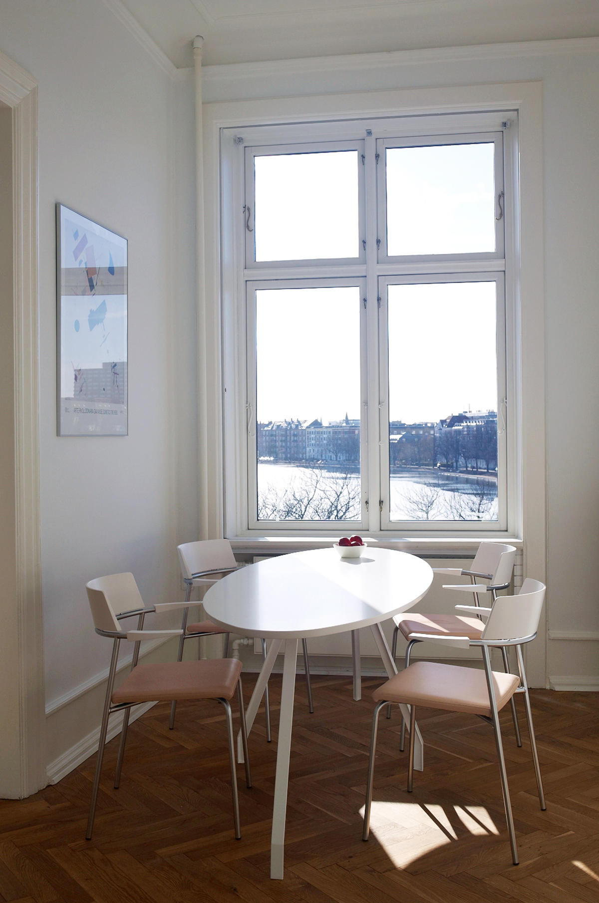 The interior-design and furnishing of the studio and living-area is deliberately kept extremely simple – and light in colors - in order to let the excellent view and day-light play the main-roles. The absence of curtains, potted plants and low-hanging pendular-lightings accentuate this theme. Artificial light comes from spots mounted in beams in the ceiling. The high positioning also helps to avoid mirror-effects in the windows, during night-time. The furniture is mainly in my own design, including special-made tables in meeting-room, studio and kitchen.
