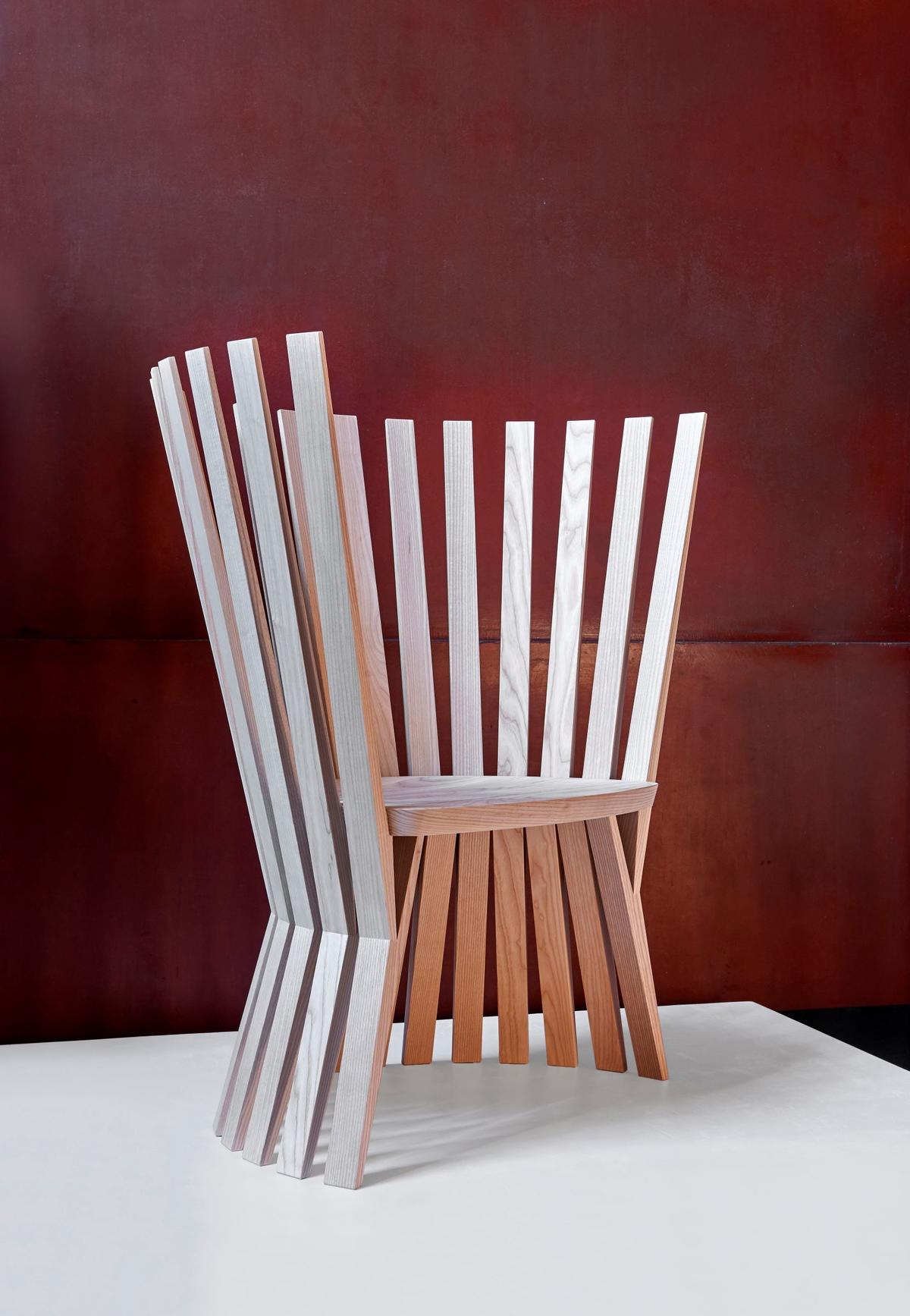 RUM (Danish for “Space”) is a throne constructed around two vertical cones. Seventeen identical elements make up the whole, encircle the sitter and question how many – or how few- identical elements it takes to create a monolithic, unified form. The chair is technically demanding, not least in the sophisticated triangular joint under the seat, where the tapered slats come together in one precise point. The chair appears most monolithic when seen form the back, appealing to the imagination as it does not really appear as a chair.