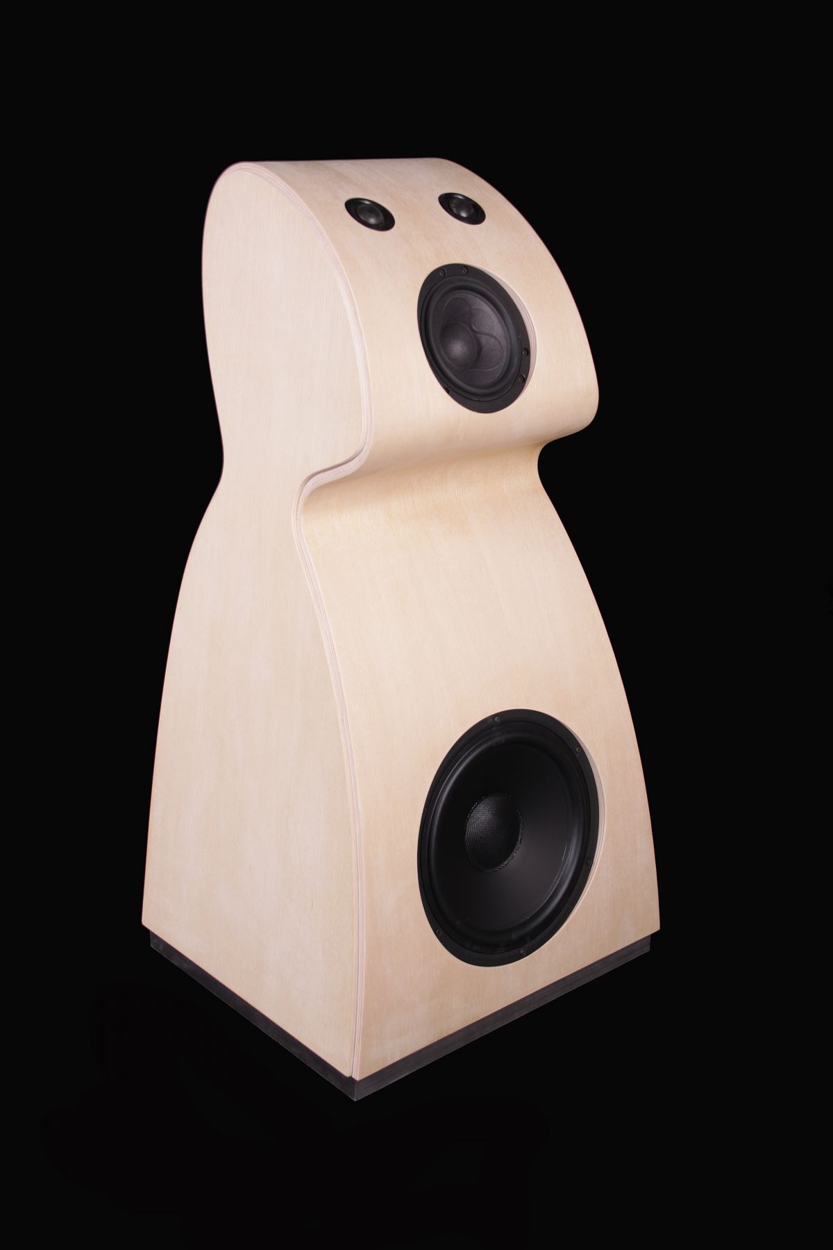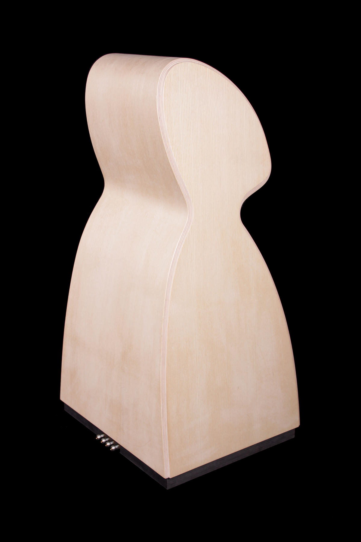 As this factory has a lot of know-how in pressing and lamination of wooden veneer, I found it natural to sketch some soft curved shapes, that would also help to avoid resonating soundwaves, a common problem in box-shaped loudspeakers. Also, partitioning the bass-part from the rest of the cabinet could be an advantage for the sound-quality.