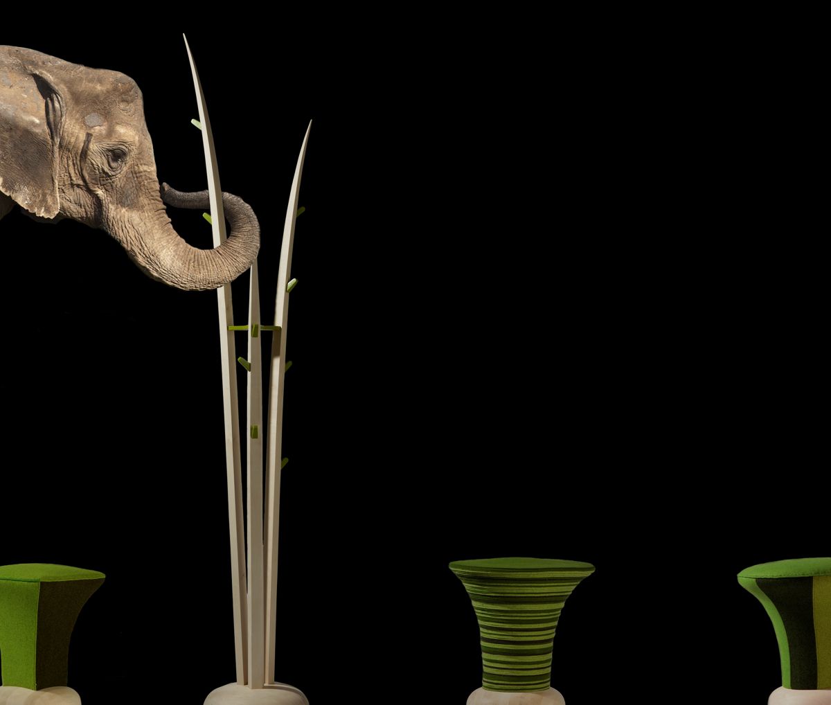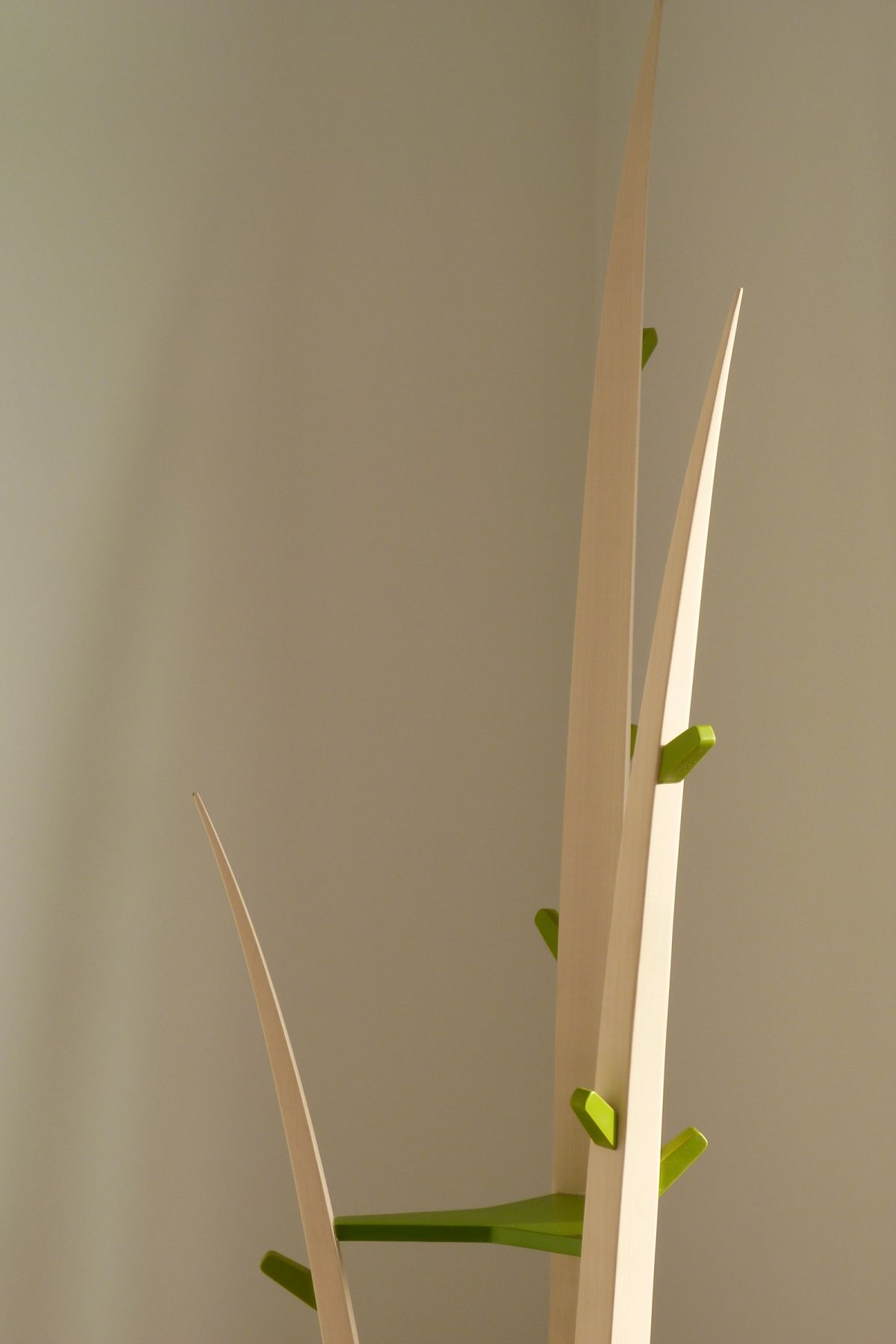 Inspired from the theme, I designed this small “family”, all with the same wooden base, which symbolizes the seed. From here, the different shapes, literally, grows into their specific function, as stools, table and coat-stand.