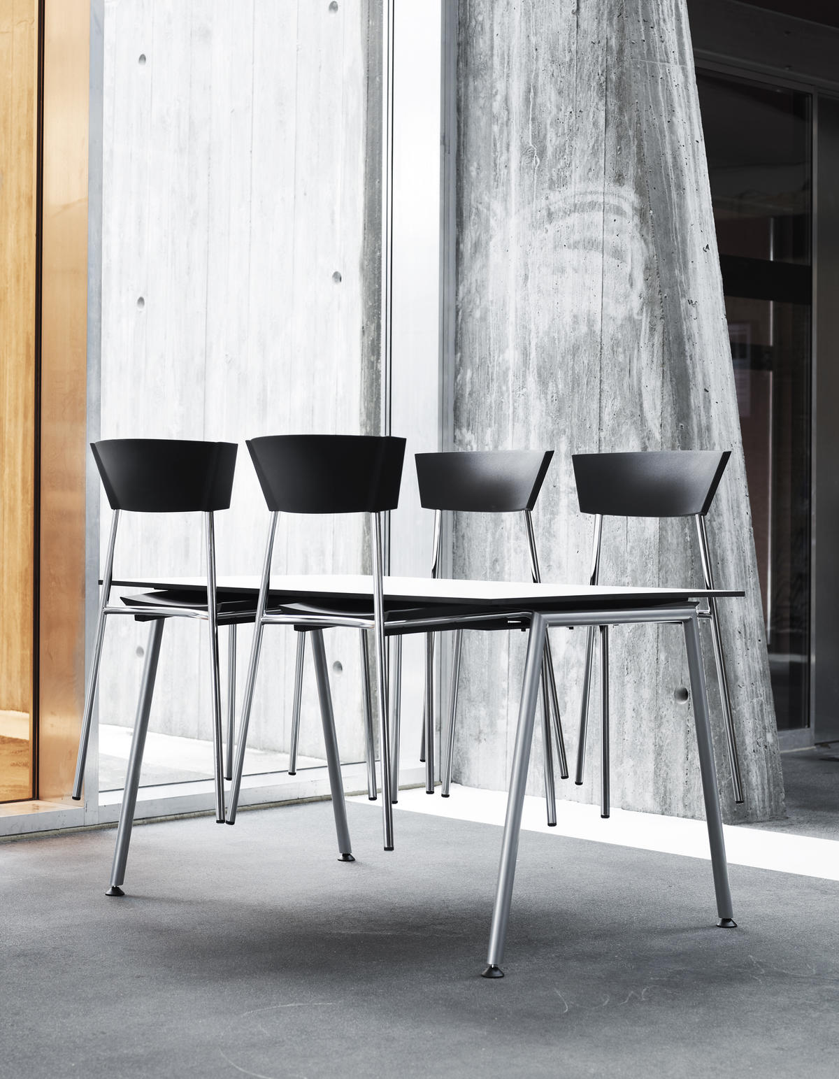 There is an integrated stacking spacer under the seat which facilitates quiet stacking without leaving marks on the chair underneath. The chair is shock resistant, cleanable and when fitted with the optional galvanized frame, can be used outdoors. The standard frame is in chromed steel and the seat/back are available in different striking colours.