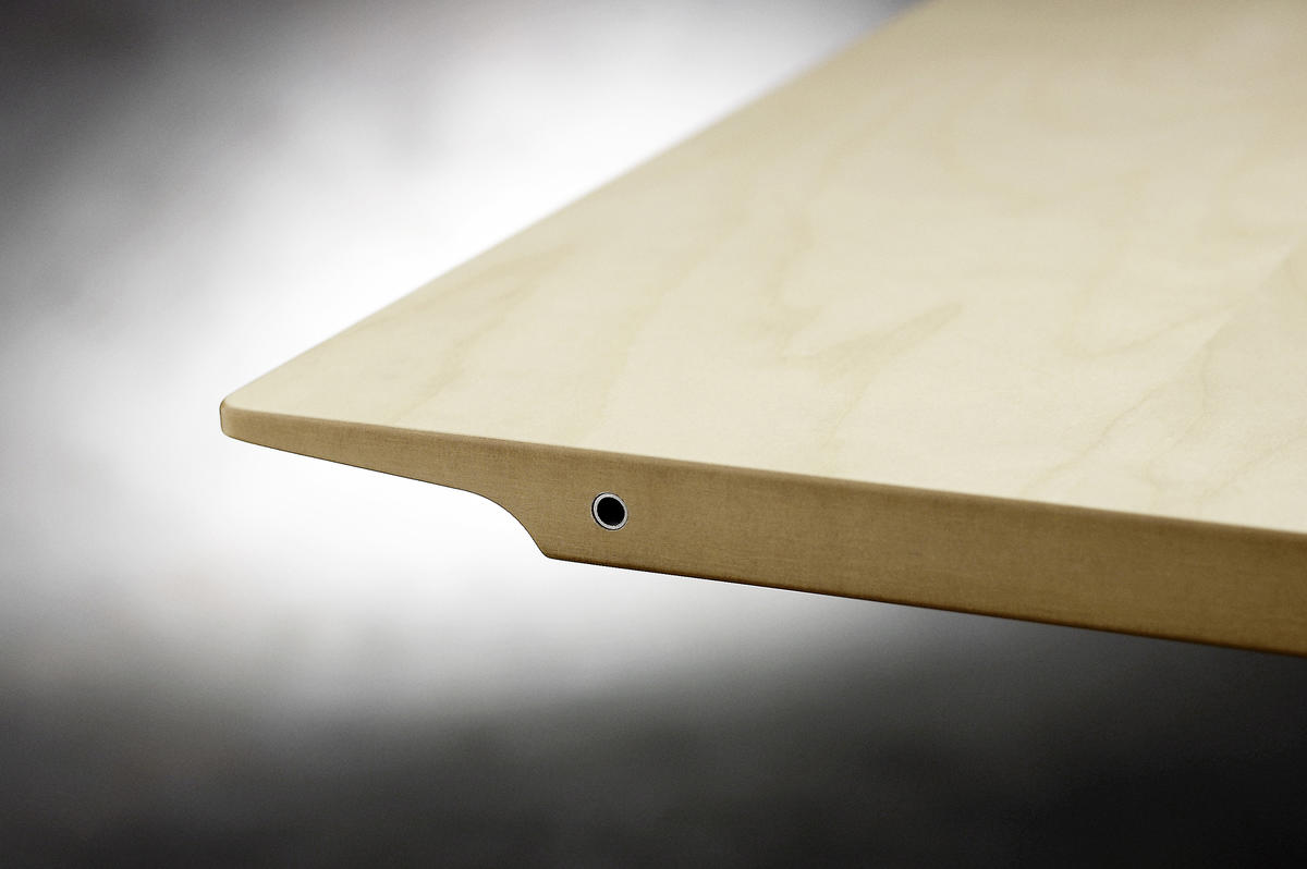 This series of column-tables is based on an idea of mine, dating back to the middle-nineties. The main-idea is quite simple: Instead of having a normal full-circle-base, I here work with a semicircular base. The column can be mounted to the tabletop in two ways: With the straight side of the base outwards – and exactly in line with the gavel of the tabletop – or with the straight side inwards. The latter way is well suited for smaller solitary tables, while the first mentioned gives the possibility to add and couple more tables. When doing that, the bases together forms complete circles and larger table-settings will appear as an architectonically calm wholeness with a minimal number of supports.
