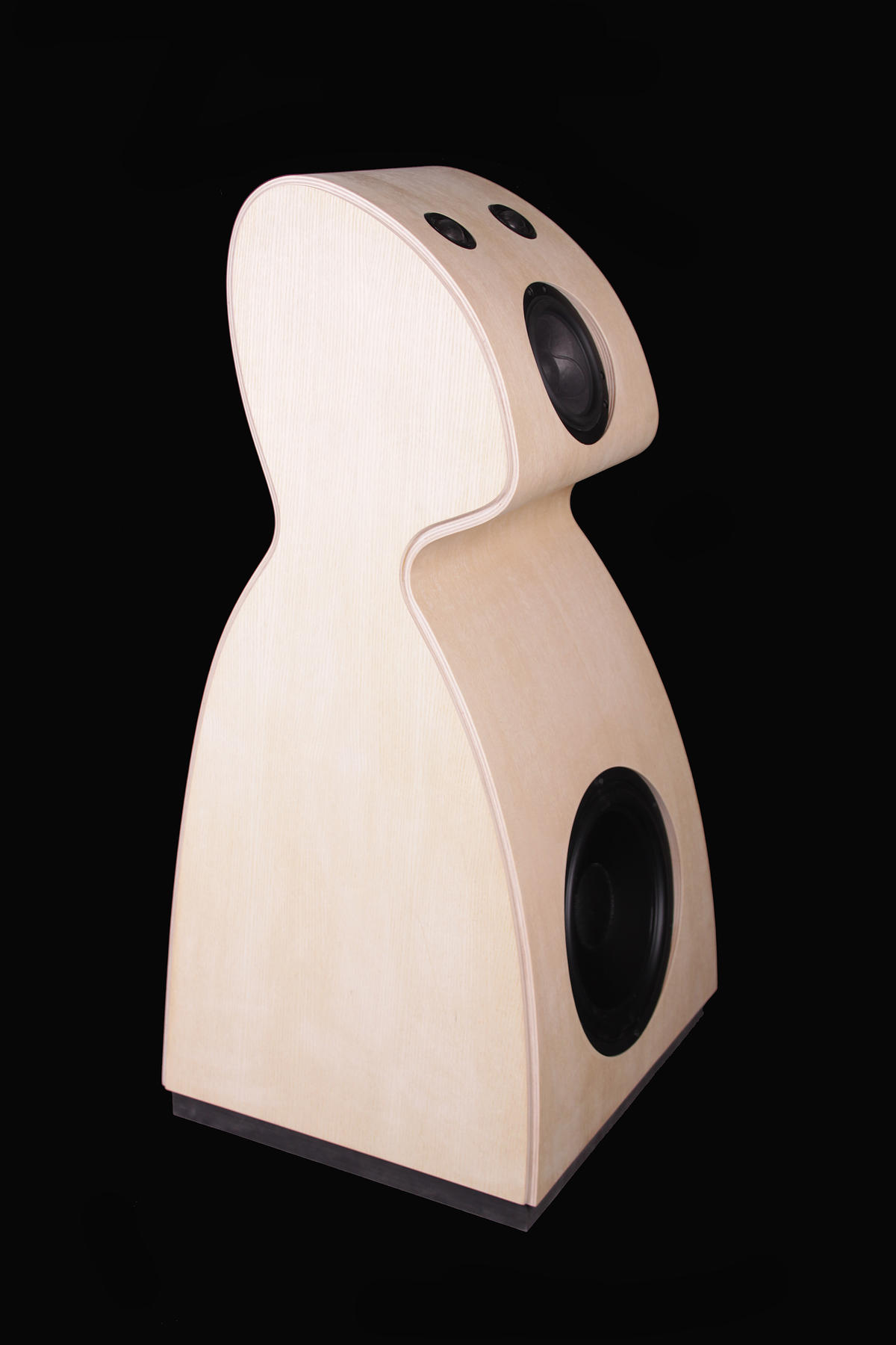 As this factory has a lot of know-how in pressing and lamination of wooden veneer, I found it natural to sketch some soft curved shapes, that would also help to avoid resonating soundwaves, a common problem in box-shaped loudspeakers. Also, partitioning the bass-part from the rest of the cabinet could be an advantage for the sound-quality.