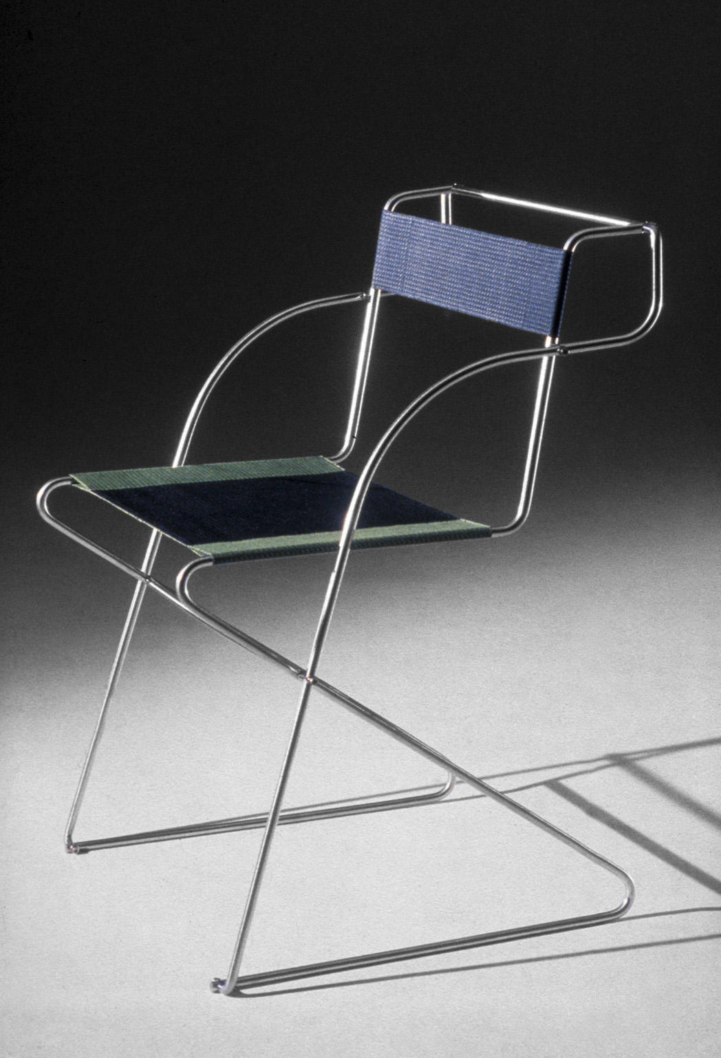 The chair combines the compact stackability of the steelrod-chair with the comfortable resilience, known from cantilever-chairs in tubular steel.